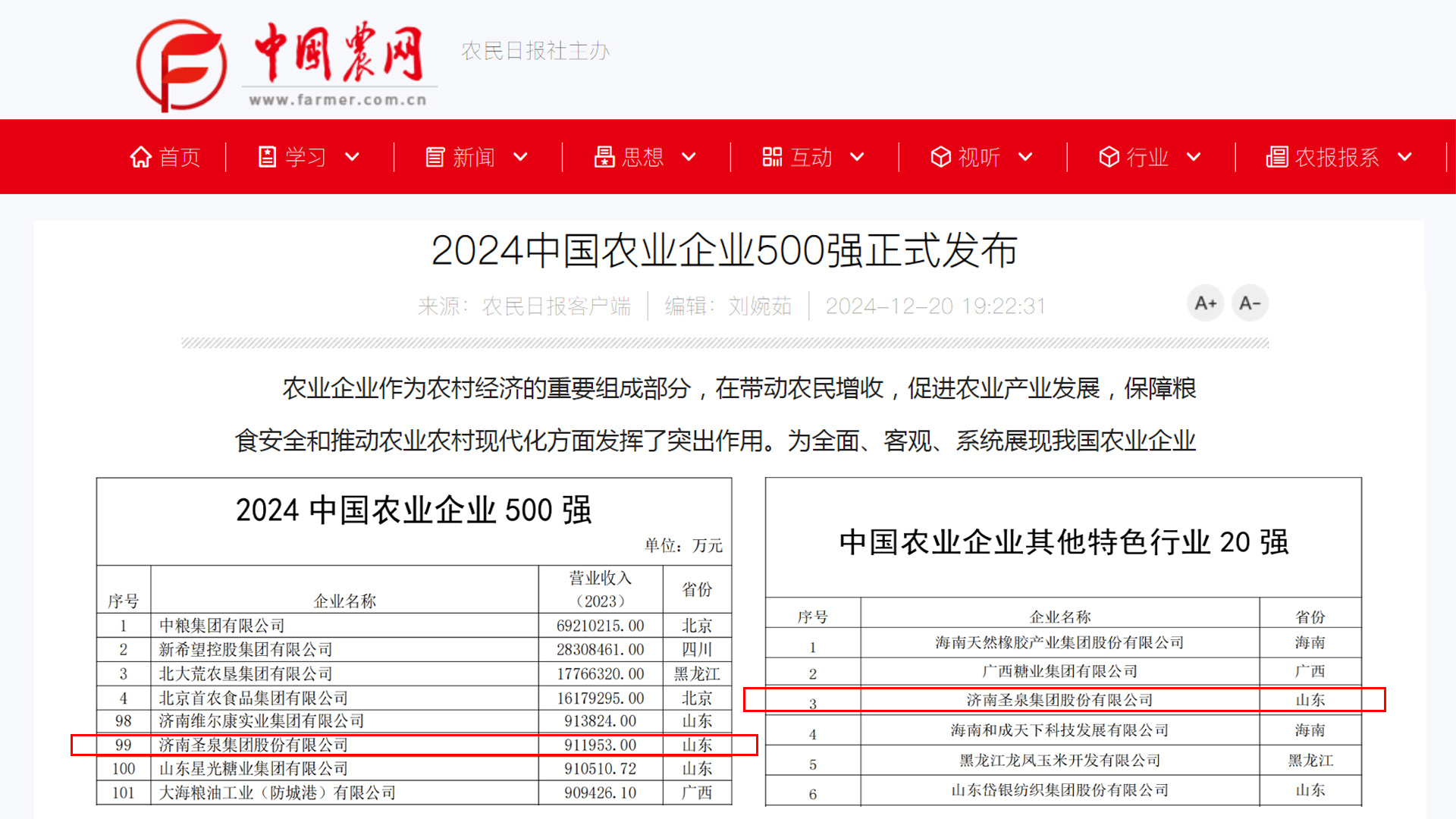 圣泉集团连续入选中国农业企业500强、中国农业企业特色行业20强